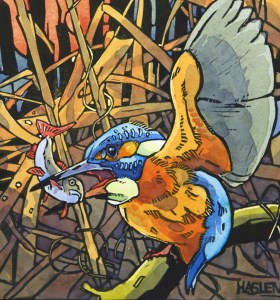 After 30 years running the gallery, I retired from that side of things and now concentrate on making art completely. I have ventured into sculpting a few times but recently it has become a passion, working in clay to produce bronzes and iron resins. I have a garden studio near a big pond, and I have created (over 35 years) and nurtured a wild patch of land. We added another pond and scrape, and to the most part let wildlife do it’s thing. We’re very lucky to see one of my favourite birds the kingfisher on a regular basis.