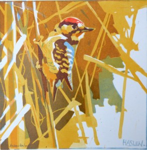 Birdwatch Artist of the Year 2018 – Sponsored by Swarovski and awarded at the Society of Wildlife Artists annual exhibition at the Mall Galleries, London. The picture that won was Lesser Spotted Woodpecker, a multi-block linocut.
