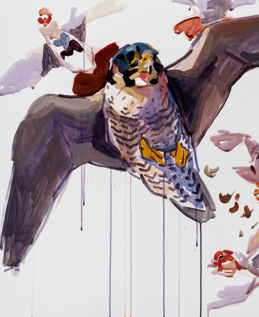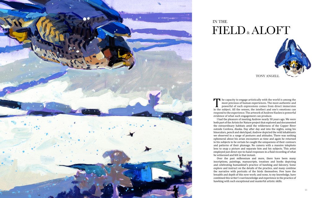 ” I have been visiting Andrew weekly since his disease prevented him from driving. On these treasured days I now work alongside him in his studio. From where I sit I can watch his bold brush work and loose style in action. The drama of a falcon dropping like a stone in her stoop. The impact of her talons striking a duck from the air and the culmination of her hunt, mantling her prey, reunited with the earth. I know in his mind he is there, kneeling beside Tassa, a hand on Cally’s back as they too are reunited, bound by the invisible golden thread known only to those who have had the privilege of such a magical relationship.” Jonathan Yule, artist.