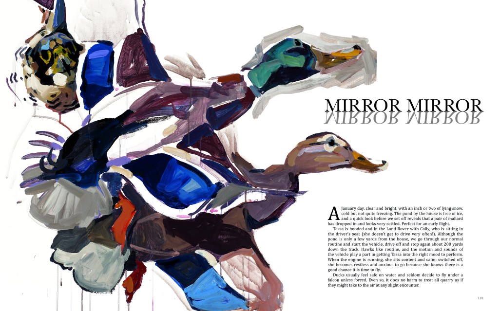 Memories of experiences I had forty years ago fill the pages; recollections, still vivid, of flying Tassa. The paintings I have produced, in many cases, are not highly finished but are deliberately sketch-like in their execution, giving fleeting glimpses, of pheasants, partridges, ducks and grouse as the falcon strikes them. They are studies from the perspective of the hunter and the hunted.